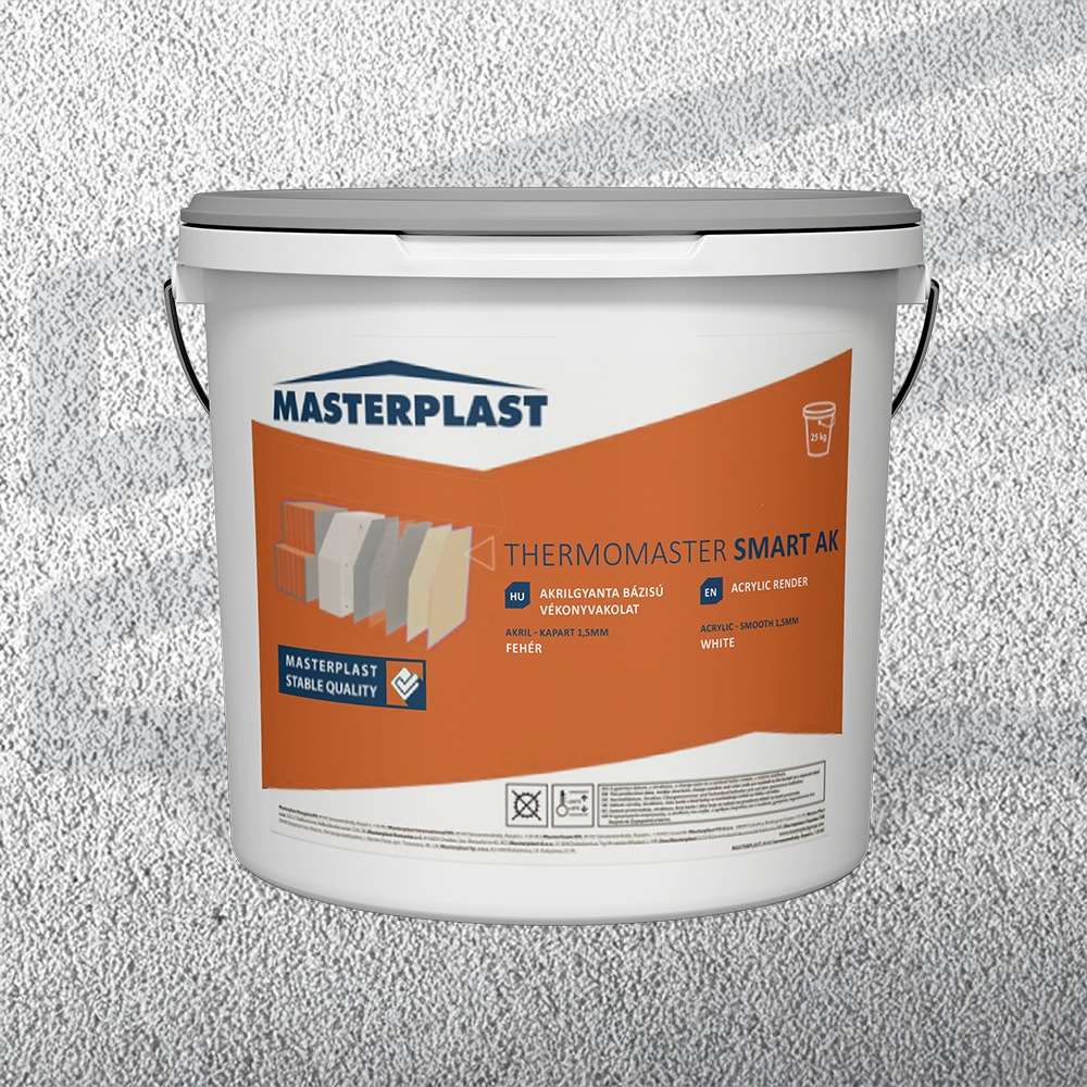 A Thermomaster Smart 1,5 mm-es szemcseméretű, kapart hatású akril vakolat, műgyanta kötőanyaggal és természetes ásványi töltőanyaggal. Finoman megmunkált homlokzatfelületekre és homlokzati hőszigetelő rendszer (ETICS) alapvakolatára készülő, időjárásálló fedőrétegként alkalmazható. (Gyártói jelölés: Thermomaster Smart AK 1,5 mm.)