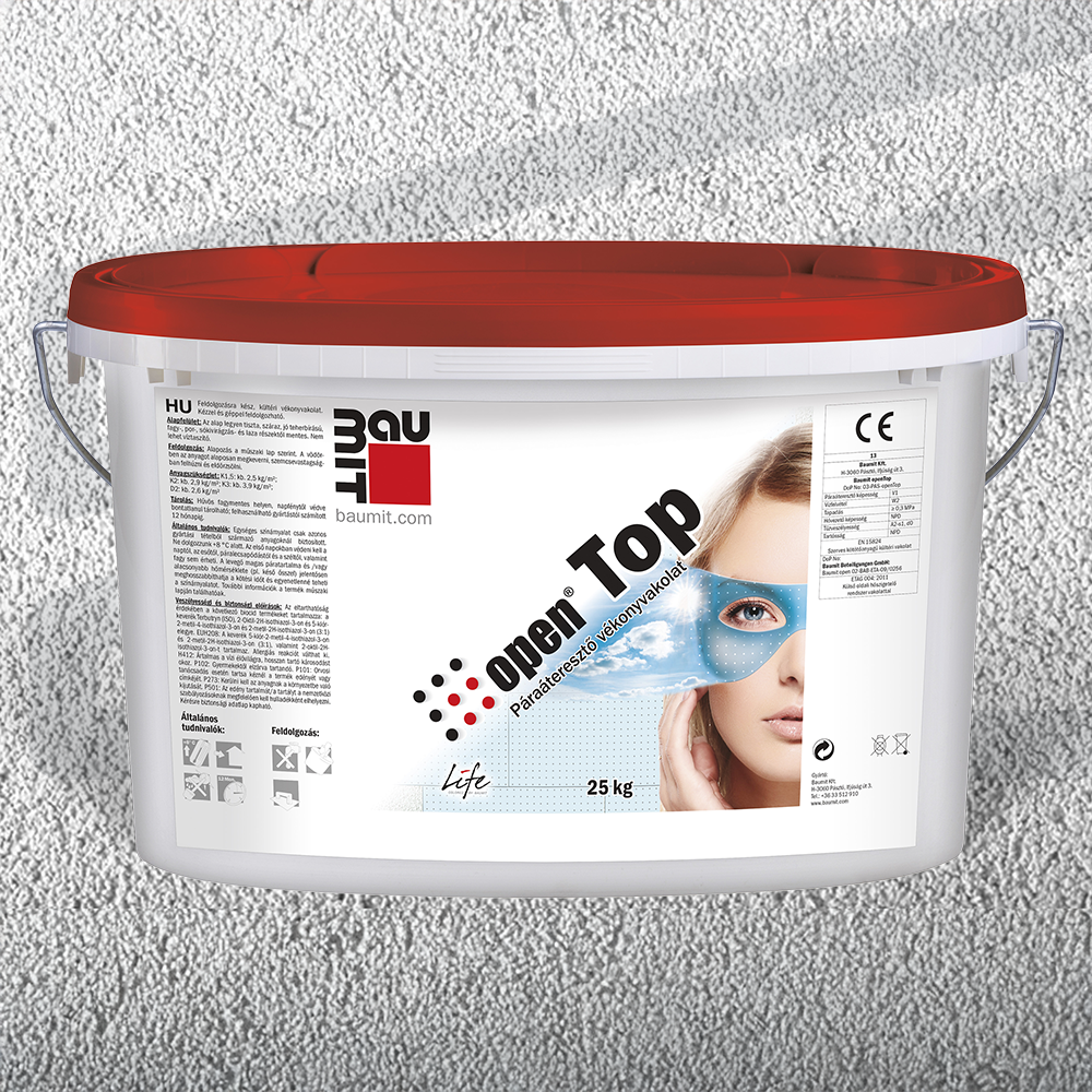 A Baumit openTop felhasználásra kész, ásványi jellegű (káli-vízüveg kötőanyagú), színes homlokzati vékonyvakolat. Rendszerben alkalmazva alkalmas az open Klímahomlokzat befejező rétegeként is. A termék egyik fő műszaki előnye a nagyon jó páraáteresztő képesség (µ kb. 20–30), ezért a gyakorlatban gyakran “lélegző / légáteresztő vakolat” megnevezéssel keresik. A vakolat kapart és dörzsölt struktúrában is alkalmazható; jelen termék a 2 mm szemcseméretű, kapart kivitel (K2).